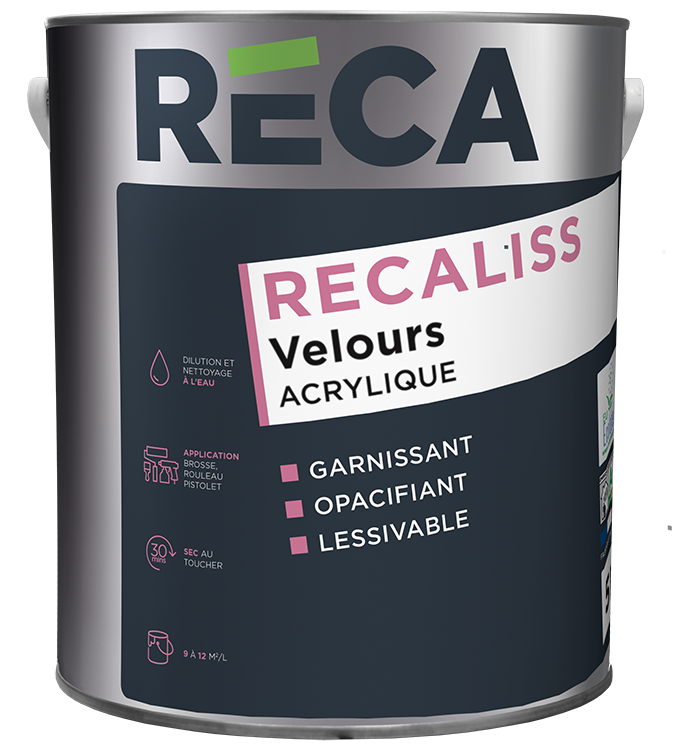 Peinture pour les murs intérieurs, le Recaliss Velours est lessivable, destiné à toutes les pièces d’habitation et les halls de grande circulation.